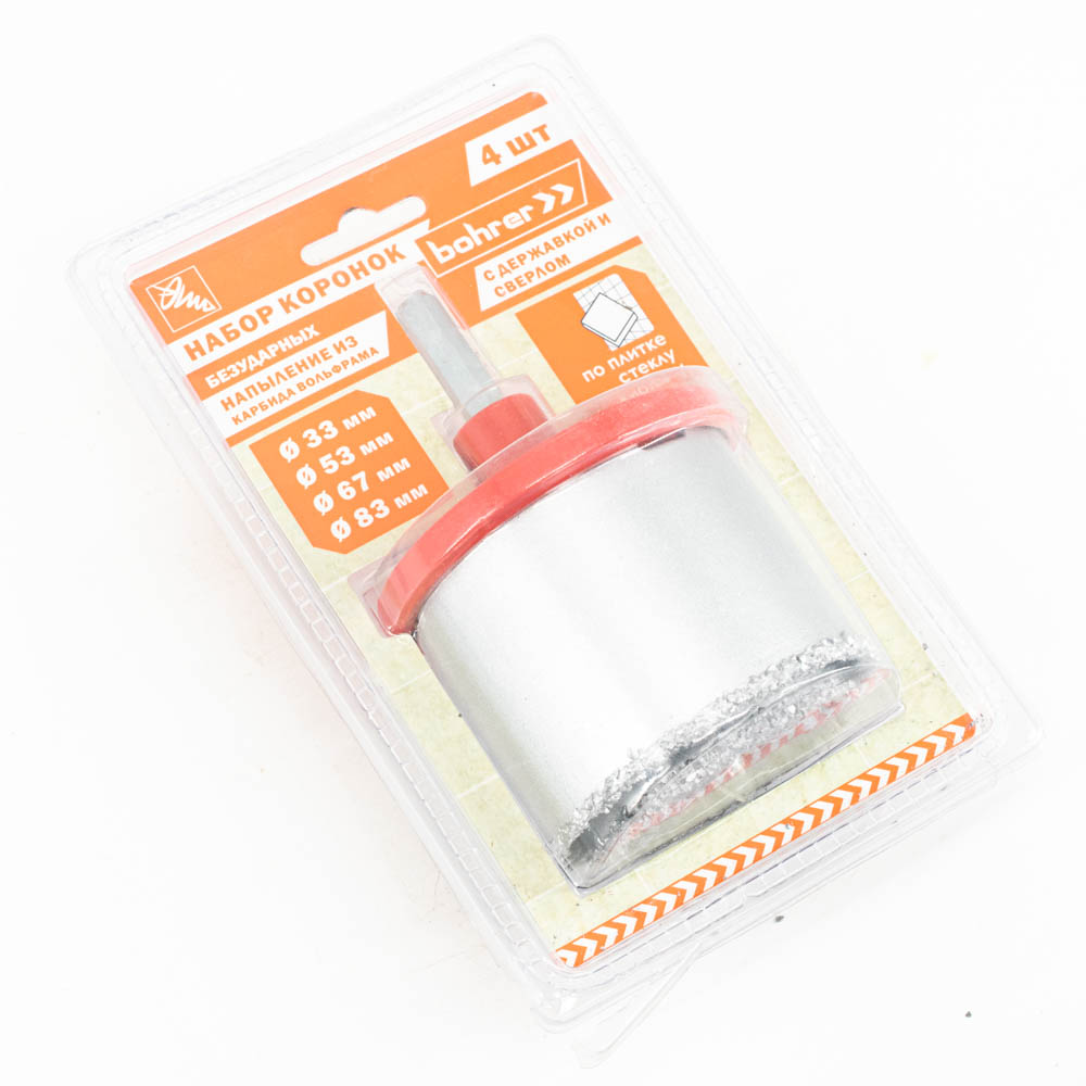 Набор коронок Bohrer 33-53-67-83 мм (по плитке, стеклу) (напыление карбида вольфрама) с державкой и центр. сверлом (безударные)