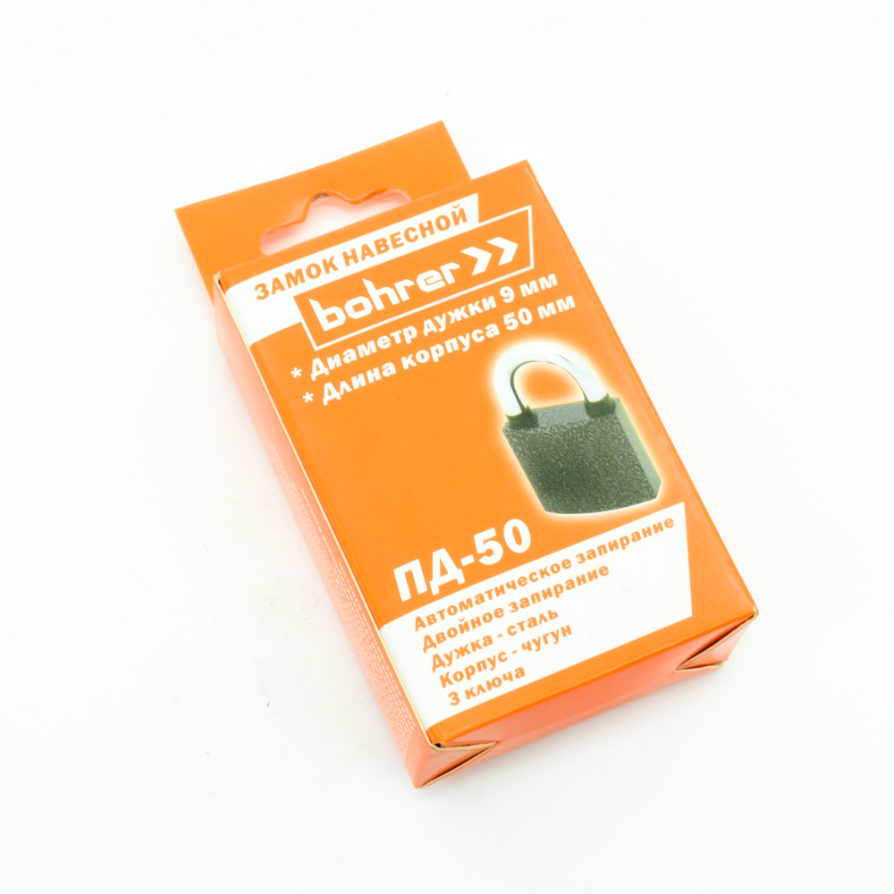 Замок навесной Bohrer ПД-50 (дужка сталь 9 мм, 3 ключа) (корпус чугун, резин. накладки на дужке) (с подвес)