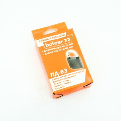 Замок навесной Bohrer ПД-63 (дужка сталь 10 мм, 3 ключа) (корпус чугун, резин. накладки на дужке) (с подвес)