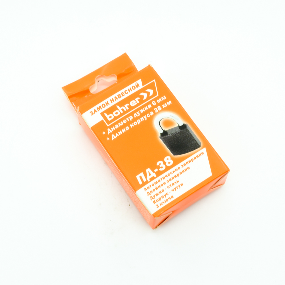Замок навесной Bohrer ПД-38 (дужка сталь 6 мм, 3 ключа) (корпус чугун, резин. накладки на дужке) (с подвес)