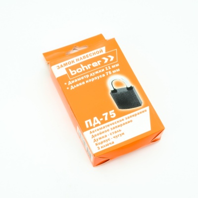Замок навесной Bohrer ПД-75 (дужка сталь 11 мм, 3 ключа) (корпус чугун, резин. накладки на дужке) (с подвес)